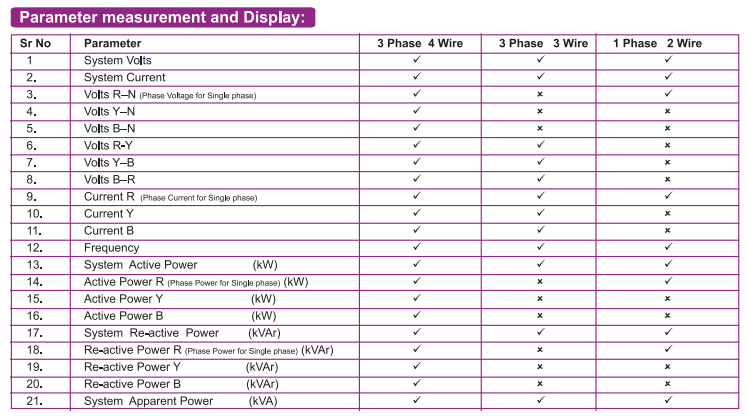 Rish Delta Power co các tính năng phổ biến như I/P – có thể lập trình 100 đến 500VLL, Aux.: 40 đến 300V AC/DC, lắp đặt dễ dàng, đo 38 thông số điện trong Mạng 3 Pha (V, I, F, Góc pha, PF, kW, kVA , kVAr, RPM, chạy giờ, trên giờ, Gián đoạn, V tối thiểu/tối đa & I) Rơle tùy chọn o/p